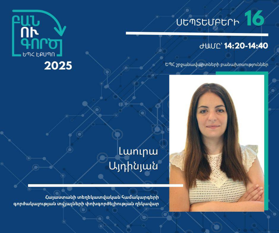 Ժամը 14:20–14:40-ը ելույթով հանդես կգա Հայաստանի տեղեկատվական համակարգերի գործակալության տվյալների փոխգործելիության ղեկավար Լաուրա Այդինյանը: