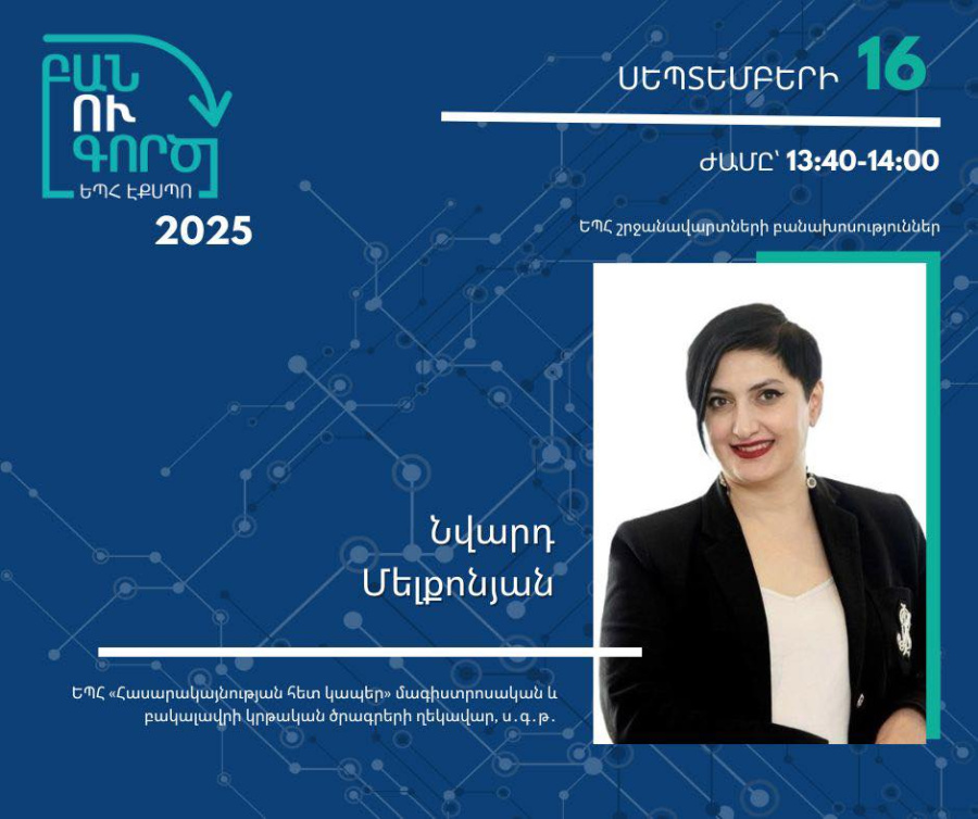Սեպտեմբերի 16-ին ԵՊՀ շրջանավարտները «ԲանՈՒԳործ․ ԵՊՀ էսքպո-2025»-ի շրջանակում հանդես են գալու թեմատիկ բանախոսություններով։