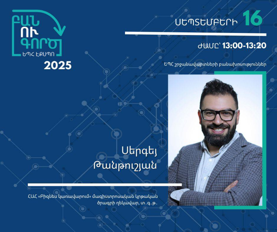 Ժամը 13:00–13:20-ը ելույթով հանդես կգա ՀԱՀ «Բիզնես կառավարում» մագիստրոսական կրթական ծրագրի ղեկավար, տ․գ․թ․ Սերգեյ Թանթուշյանը։