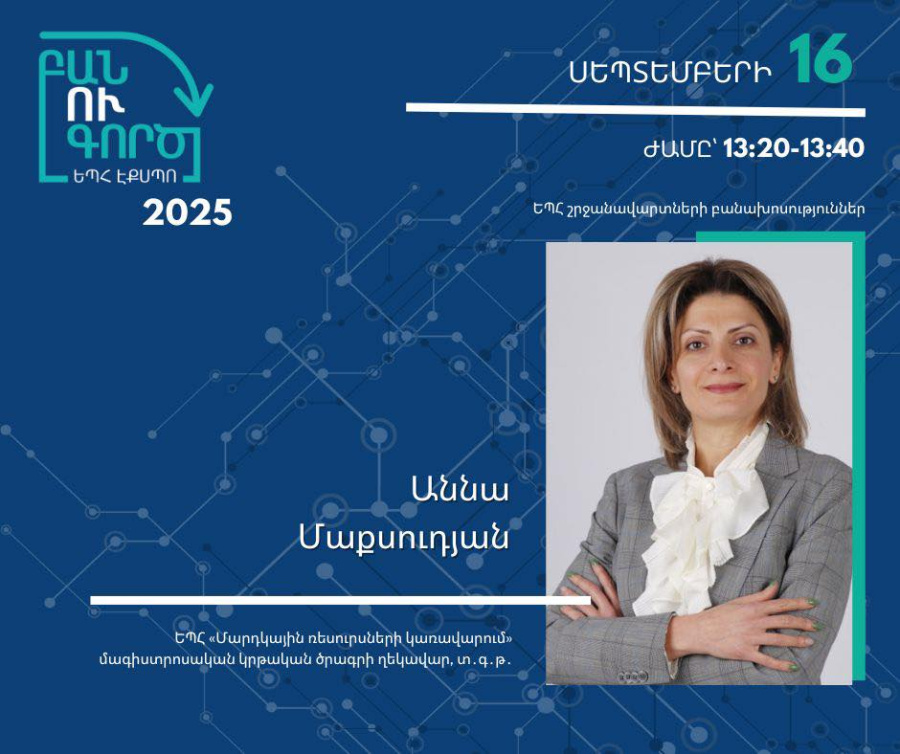 Ժամը 13:20–13:40-ը ելույթով հանդես կգա ԵՊՀ «Մարդկային ռեսուրսների կառավարում» մագիստրոսական կրթական ծրագրի ղեկավար, տ․գ․թ․ Աննա Մաքսուդյանը: