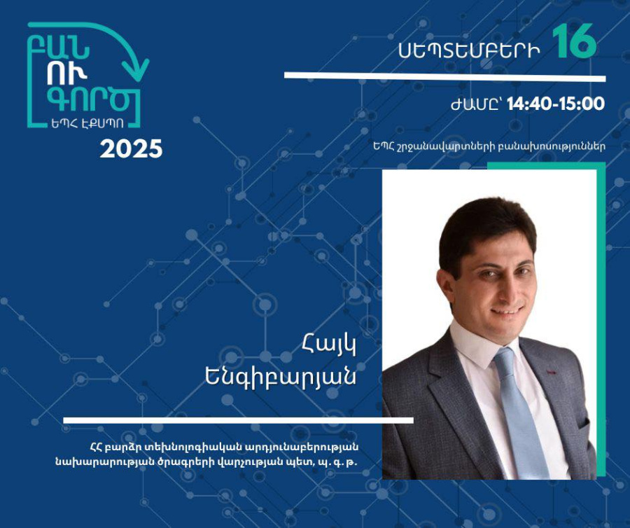 Ժամը 14:40–15:00-ը ելույթով հանդես կգա ՀՀ բարձր տեխնոլոգիական արդյունաբերության նախարարության ծրագրերի վարչության պետ, պ․գ․թ․ Հայկ Ենգիբարյանը: