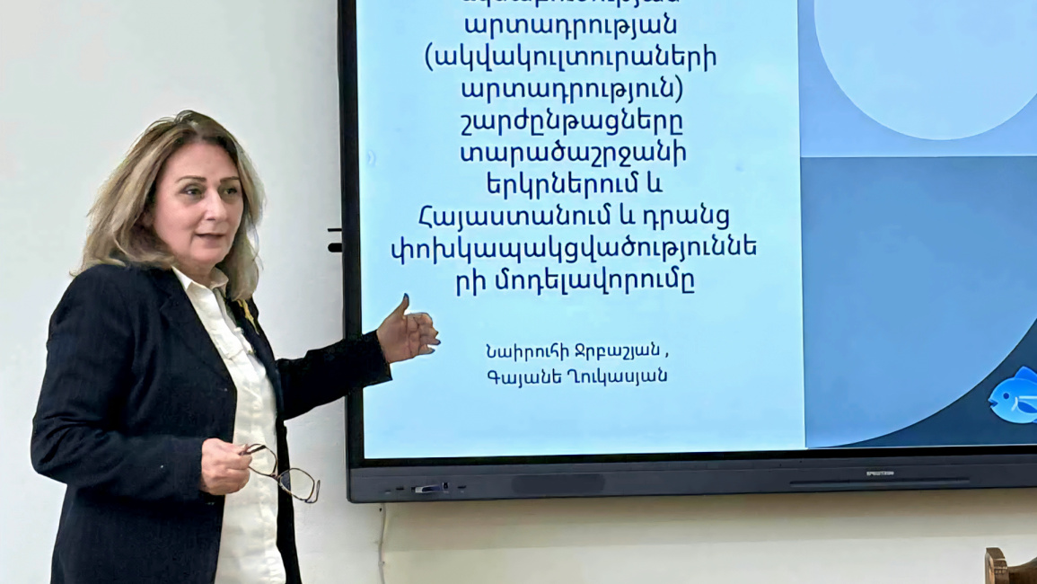 On December 12 of this year, the YSU Faculty of Economics and Management hosted scientific seminar, during which Associate Professor Nairuhi Jrbashyan from the Chair of Mathematical Modeling in Economics presented her research on "Trends in Aquaculture Production in the Region and Armenia and the Modeling of Their Interconnections".