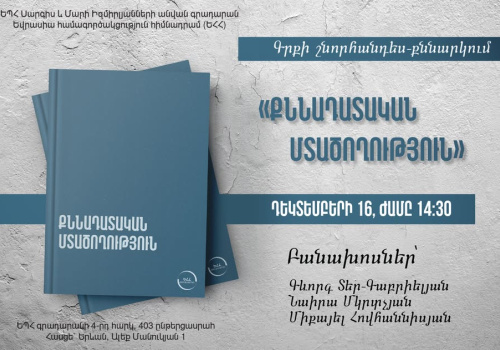 Ս.թ. դեկտեմբերի 16-ին՝ ժամը 14:30-ին, ԵՊՀ Սարգիս և Մարի Իզմիրլյանների անվան գրադարանում տեղի կունենա «Քննադատական մտածողություն» գրքի շնորհանդես-քննարկումը: