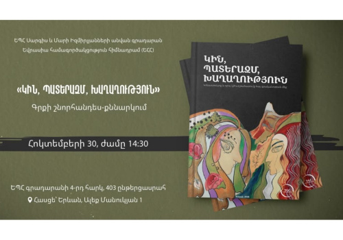 «Կին, պատերազմ, խաղաղություն» գրքի շնորհանդես-քննարկումը ԵՊՀ-ում Ս.թ. հոկտեմբերի 30-ին՝ ժամը 14:30-ին, ԵՊՀ Սարգիս և Մարի Իզմիրլյանների անվան գրադարանում տեղի կունենա «Կին, պատերազմ, խաղաղություն» գրքի շնորհանդես-քննարկումը: