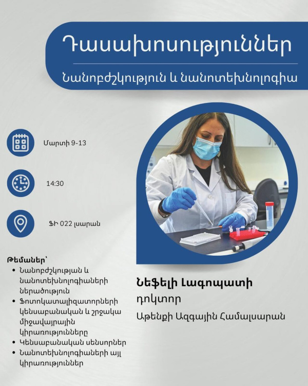 Ս.թ. մարտի 9-13-ը՝ ժամը 14:30-ին, ԵՊՀ ֆիզիկայի ինստիտուտում (022 լսարան) Նյութագիտության և նանոտեխնոլոգիաների ամբիոն-կենտրոնի նախաձեռնությամբ կկազմակերպվի դասախոսությունների շարք, որը կվարի դոկտոր Նեֆելի Լագոպատին՝ Աթենքի ազգային և կապոդիստրիան համալսարանի (Հունաստան) կենսաբանության և նանոբժշկության ոլորտի գիտնականը։ Այցը կազմակերպվում է «Էրազմուս+» միջազգային փոխանակման ծրագրի շրջանակում։