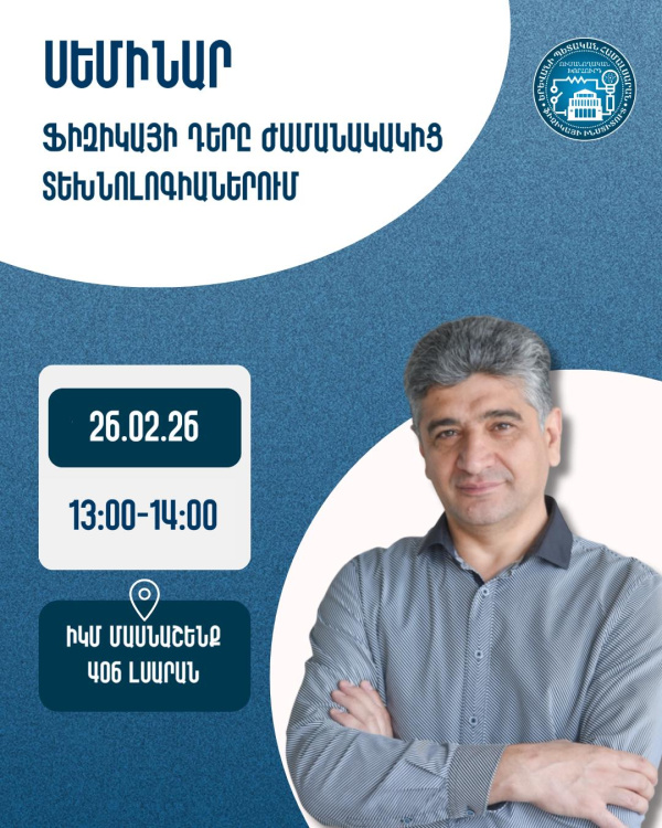 Ս.թ. փետրվարի 26-ին՝ ժամը 13:30-ին, ԵՊՀ ֆիզիկայի ինստիտուտի ուսանողական խորհրդի գիտակրթական հանձնաժողովի նախաձեռնությամբ կանցկացվի սեմինար՝ «Ֆիզիկայի դերը ժամանակակից տեխնոլոգիաներում» թեմայով: