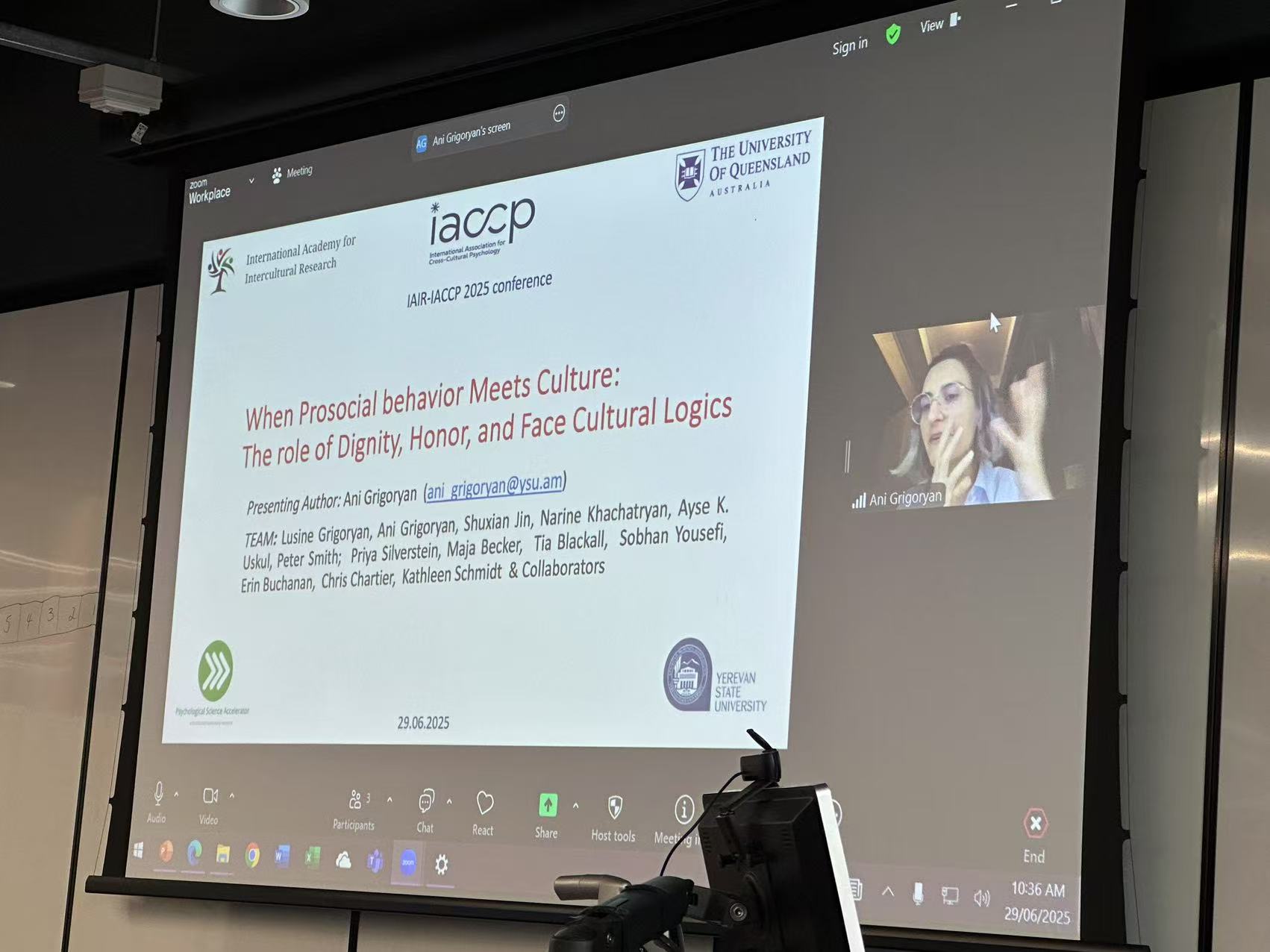 Նշանակալի ծրագրերից էր Ավստրալիայի Բրիսբեն քաղաքում անցկացված միջմշակութային հոգեբանության ոլորտում աշխարհում ամենամեծ համաժողովը, որը վերաբերում էր արժանապատվության, պատվասիրության և դեմքը չկորցնելու արժեքային կողմնորոշումներին։ ԵՊՀ անձ և սոցիալական միջավայր գիտահետազոտական լաբորատորիայի գիտաշխատող Անի Գրիգորյանը հունիսի 20-ին բանավոր զեկույցով հանդես եկավ համաժողովում, որն աշխարհում նմանատիպ առաջին ամենամեծ հետազոտական նախագիծն էր, և ներկայացրեց գիտահետազոտական արդյունքներ։