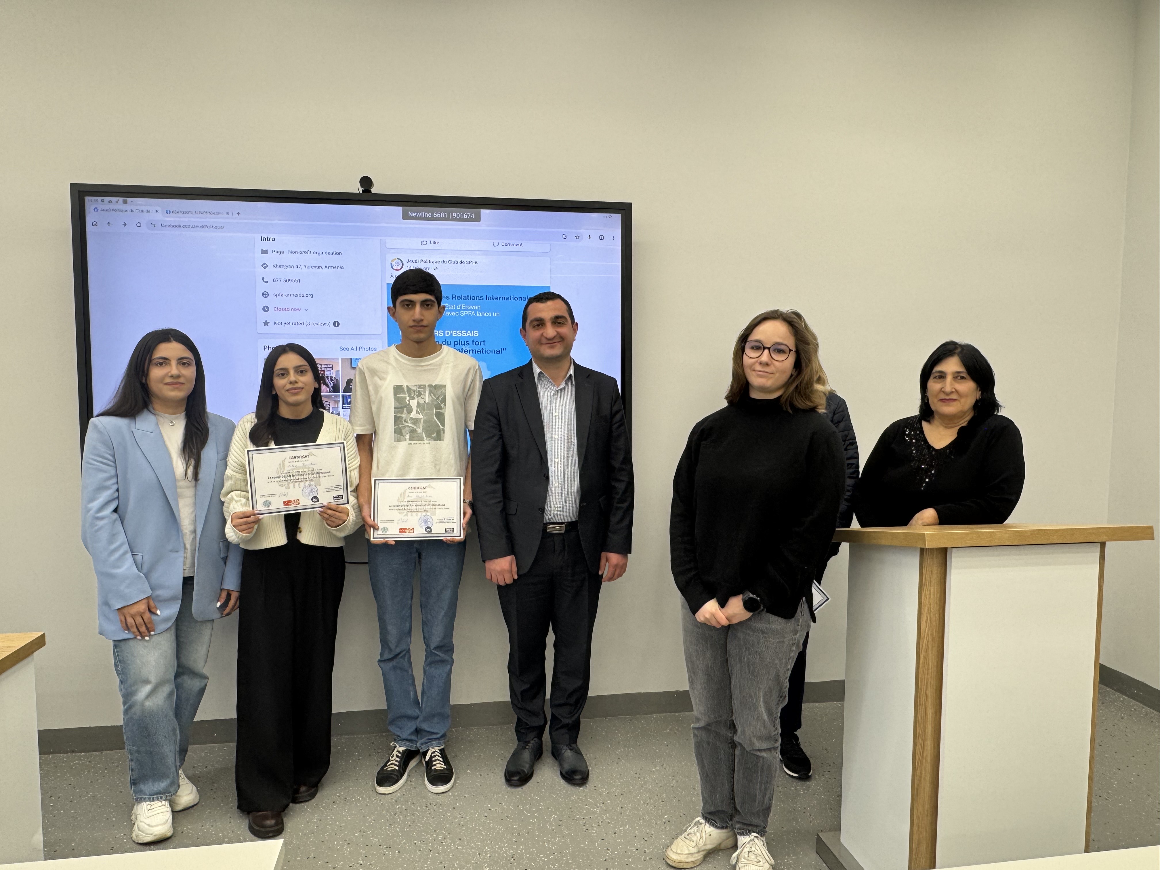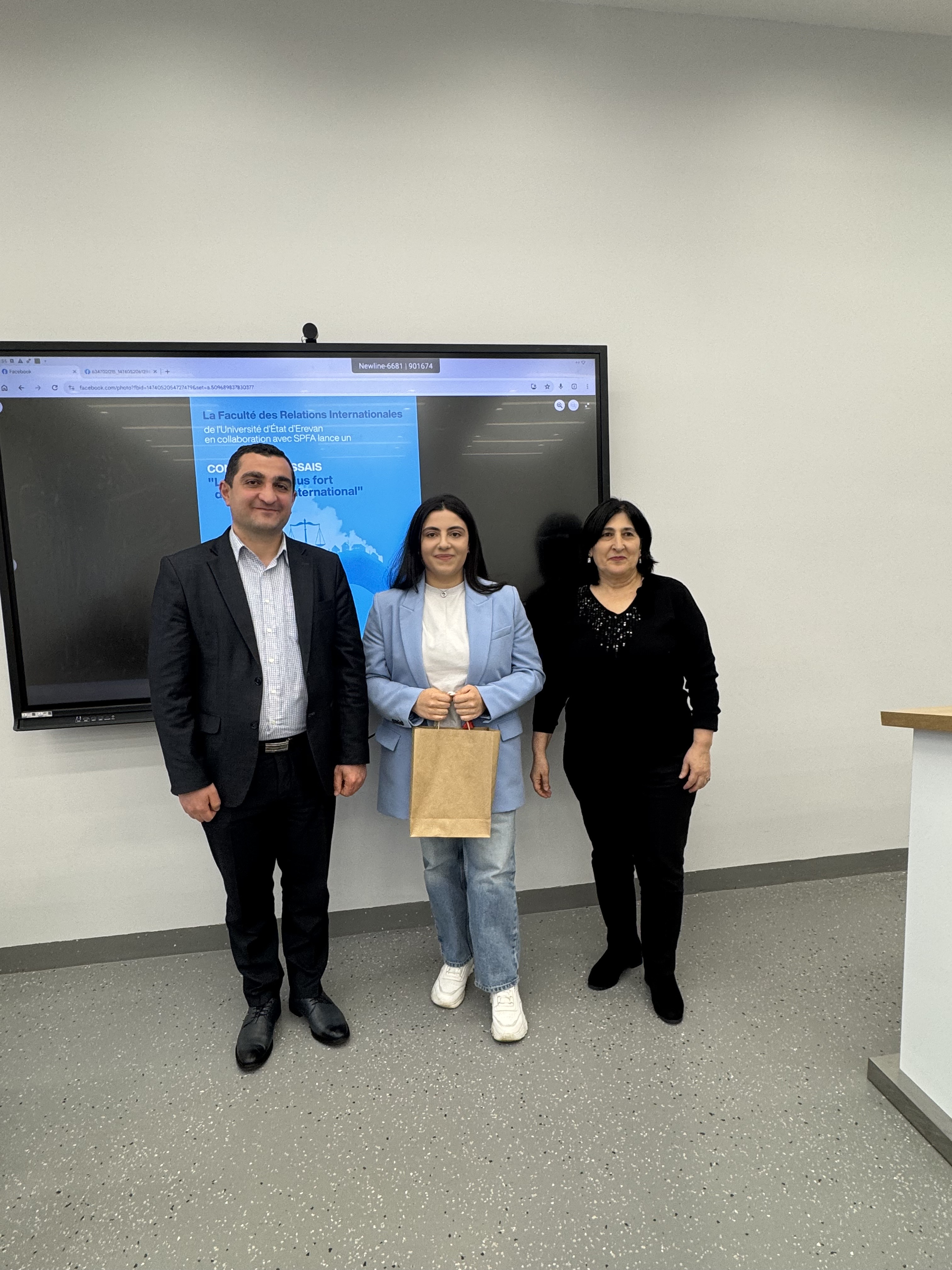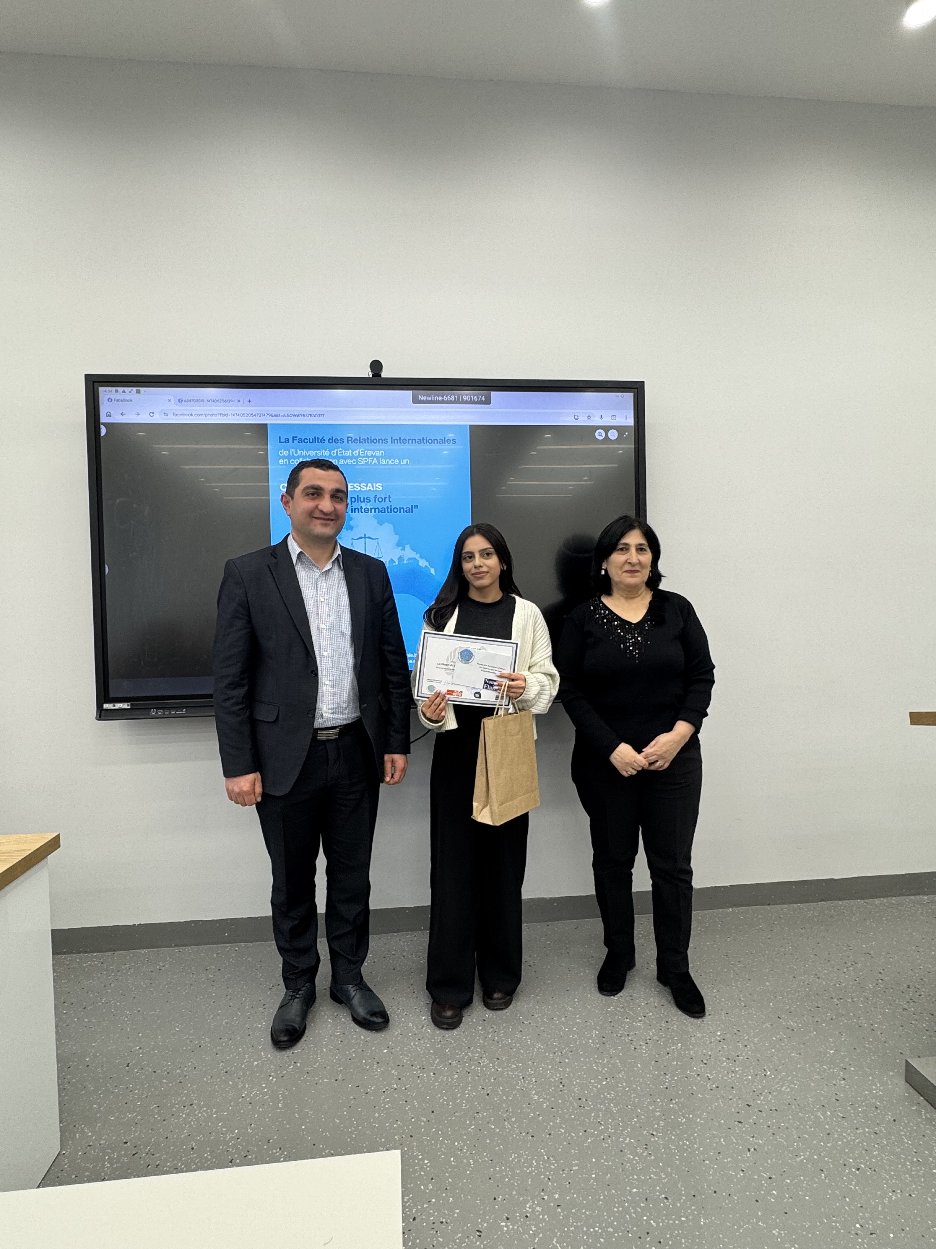 Մրցույթի հաղթողներին հավաստագրեր հանձնեց ֆակուլտետի դեկան, պ.գ.թ., դոցենտ Տիգրան Եփրեմյանը։ Շնորհավորելով մրցանակակիրներին՝ նա իր խոսքում կարևորեց ֆրանսերենի դերը ապագա դիվանագետների մասնագիտական գործունեության մեջ՝ ընդգծելով, որ ֆրանսերենը շարունակում է մնալ միջազգային հարաբերությունների և դիվանագիտության կարևոր լեզուներից մեկը։ Դեկանը, կարևորելով ուսանողների ակտիվ ներգրավվածությունն ու մասնագիտական աճը, իր պատրաստակամությունը հայտնեց աջակցելու նմանատիպ գիտակրթական նախաձեռնությունների շարունակական կազմակերպմանը:
