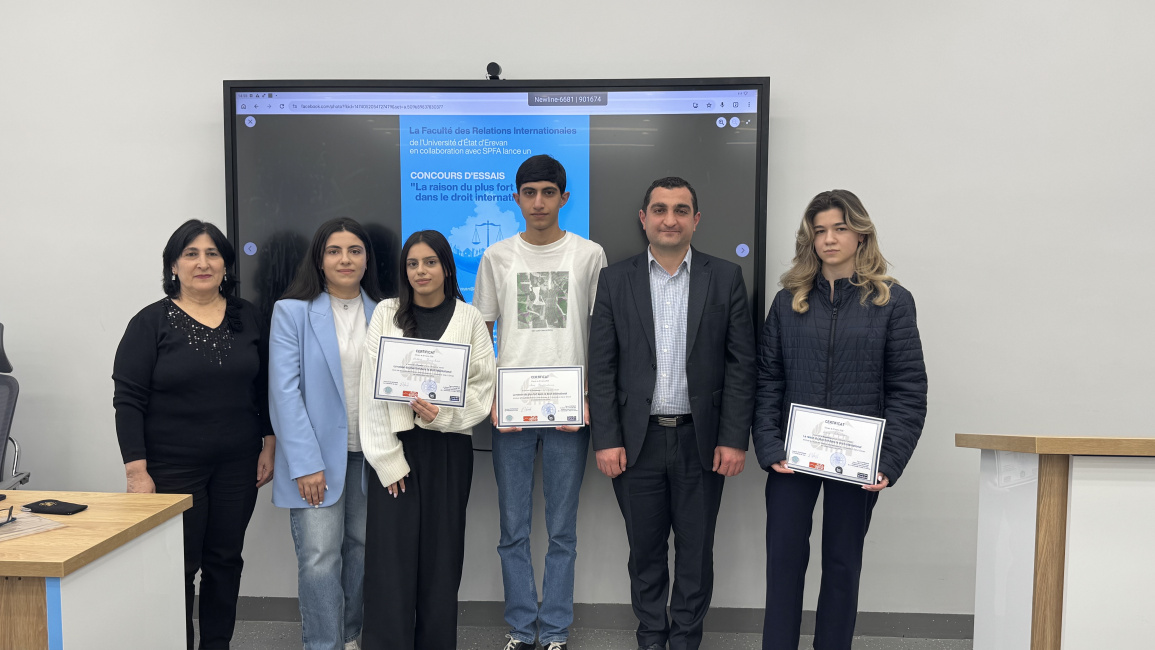 ԵՊՀ միջազգային հարաբերությունների ֆակուլտետում Ֆրանկոֆոնիայի միջազգային օրվա և Հայաստանում Ֆրանկոֆոնիայի երկամսյակի մեկնարկի կապակցությամբ տեղի ունեցավ «Ուժի իրավունքը միջազգային իրավունքում» թեմայով էսսեների մրցույթի մրցանակաբաշխության հանդիսավոր արարողությունը։ Միջոցառումը նպատակ ուներ խթանելու ուսանողների հետաքրքրությունը միջազգային իրավունքի արդիական խնդիրների նկատմամբ, ինչպես նաև զարգացնելու ֆրանսերենով մասնագիտական գրավոր խոսքը։