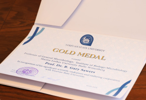 ԵՊՀ ռեկտոր Հովհաննես Հովհաննիսյանը Մարտին Լյութերի անվան Հալլե-Վիտենբերգի համալսարանի (Գերմանիա) պրոֆեսոր Գարի Սովերսին շնորհեց ԵՊՀ ոսկե մեդալ՝ գիտության ոլորտում նրա ներդրումների և Երևանի պետական համալսարանի, մասնավորապես Կենսաբանության ֆակուլտետի հետ ունեցած սերտ համագործակցության համար:
