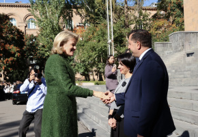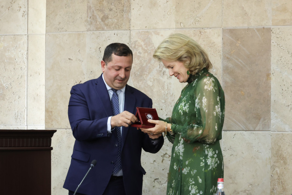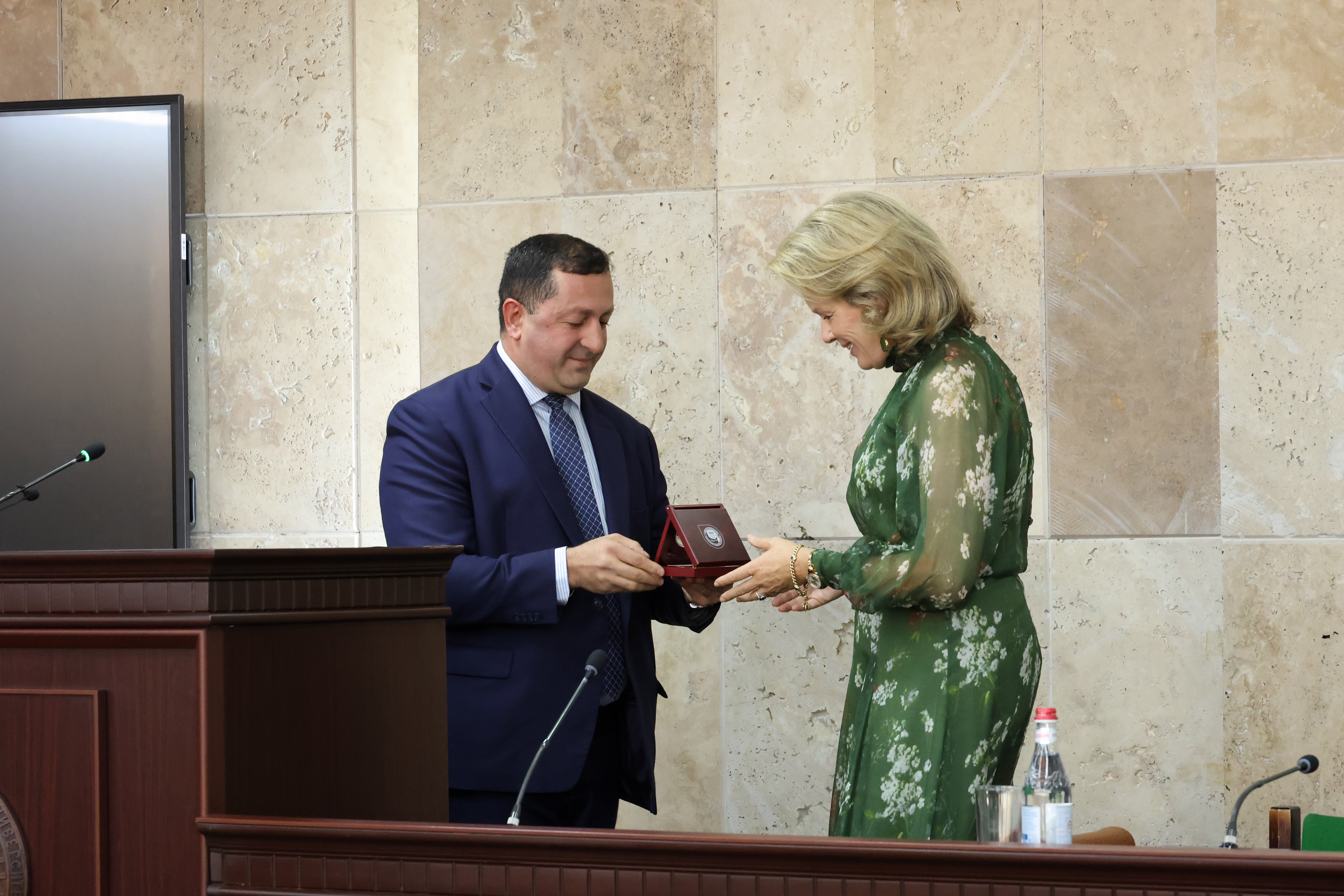 Երևանի պետական համալսարանում կայացած հանդիպման ընթացքում ԵՊՀ ռեկտոր Հովհաննես Հովհաննիսյանը համալսարանի ուսանողների, դասախոսների, ինչպես նաև աշխատակիցների անունից Բելգիայի թագուհուն հանձնեց ԵՊՀ հիմնադրման 100-ամյակի հուշադրամ։