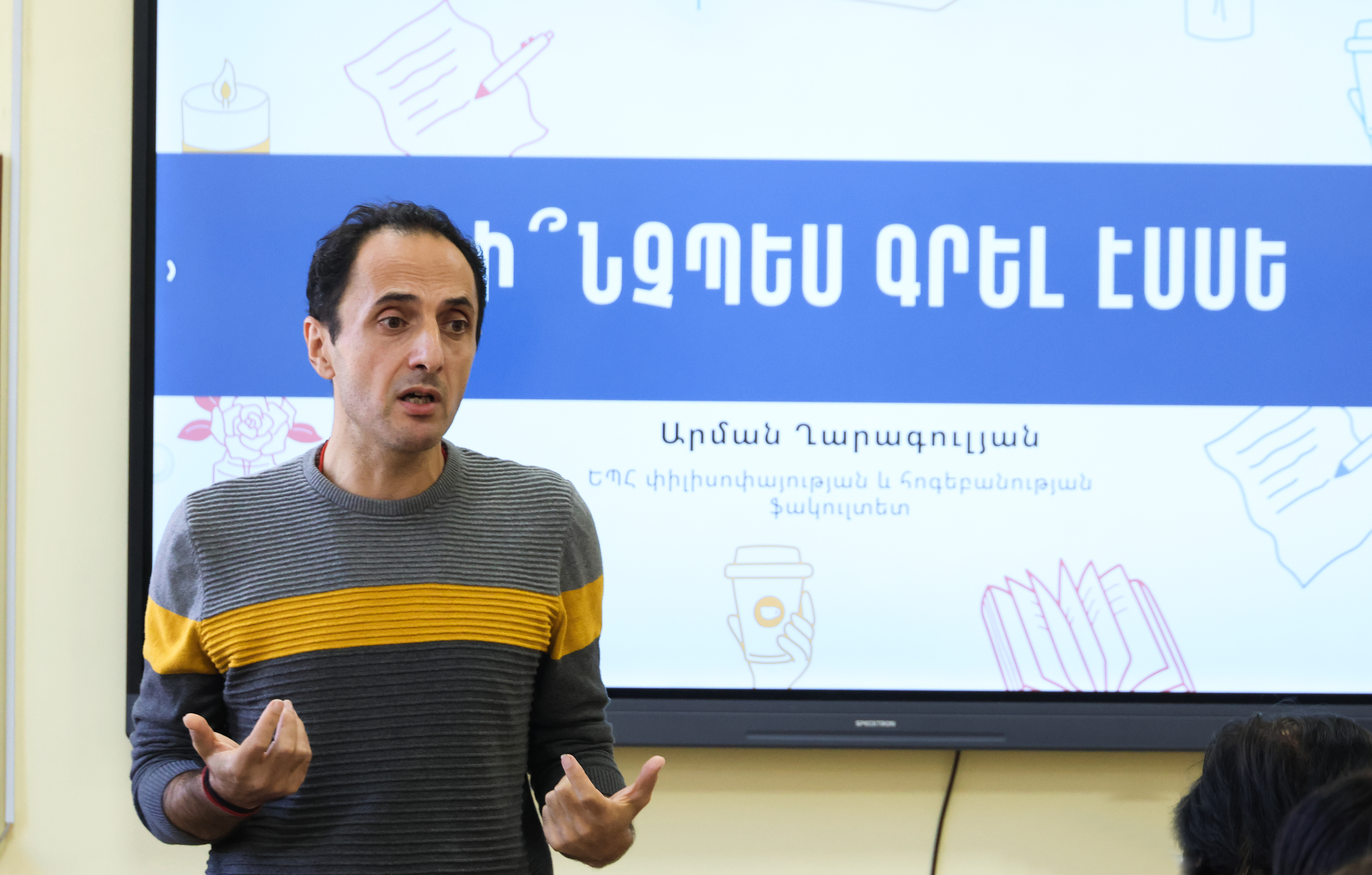 ԵՊՀ-ում անցկացվեց «Էսսեագրություն» թեմայով հանդիպում՝ նպատակ ունենալով հանրակրթական դպրոցների աշակերտներին ծանոթացնելու էսսե գրելու առանձնահատկություններին։ Փիլիսոփայության և հոգեբանության ֆակուլտետի ու Ընդունելության և դիմորդների հետ տարվող աշխատանքների կենտրոնի համատեղ նախաձեռնությամբ կազմակերպված հանդիպման բանախոսն էր ԵՊՀ սոցիալական փիլիսոփայության, բարոյագիտության և գեղագիտության ամբիոնի դոցենտ Արման Ղարագուլյանը։