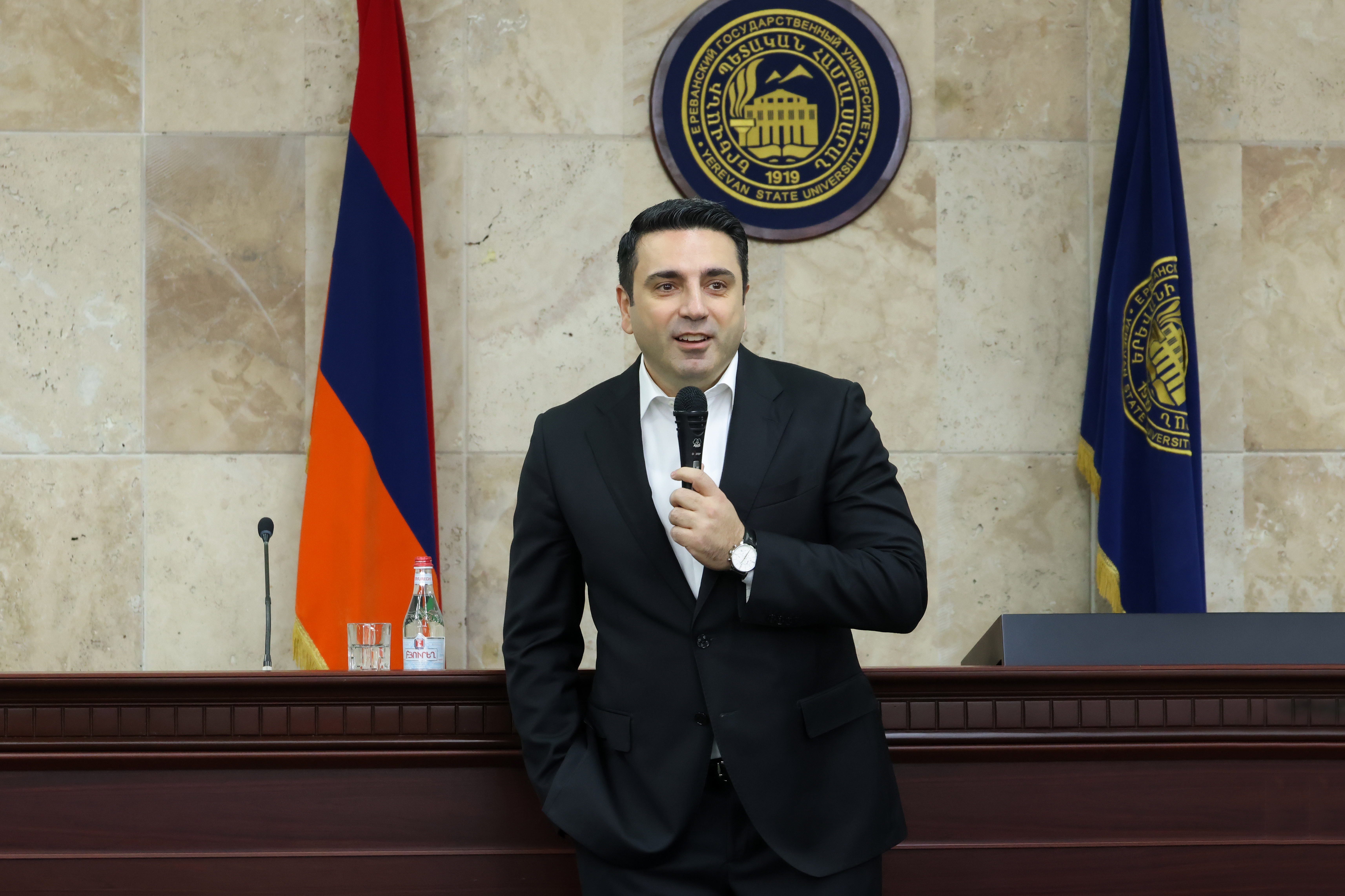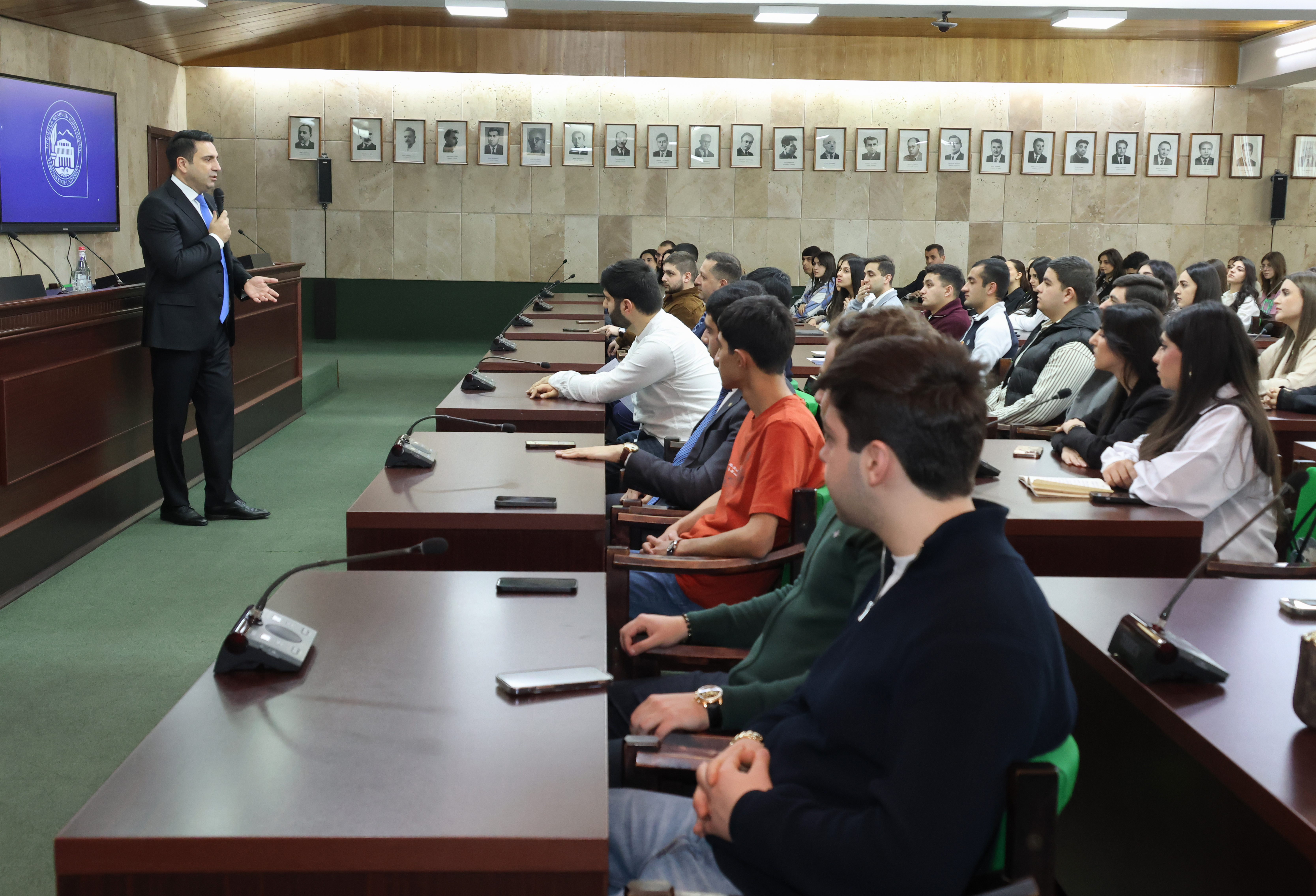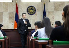 ԱԺ նախագահը ուսանողների հետ հանդիպման ընթացքում անդրադարձավ նաև քաղաքական գործունեությանը, միջազգային հարաբերություններին, ժողովրդավարությանն ու պետության ինքնիշխանությանը, ինչպես նաև ընդգծեց երիտասարդների ակտիվ մասնակցության անհրաժեշտությունը՝ կարևորելով քննադատական մտածողությունը, ազատ արտահայտվելու իրավունքը և հասարակական գործընթացներում ներգրավվածությունը։