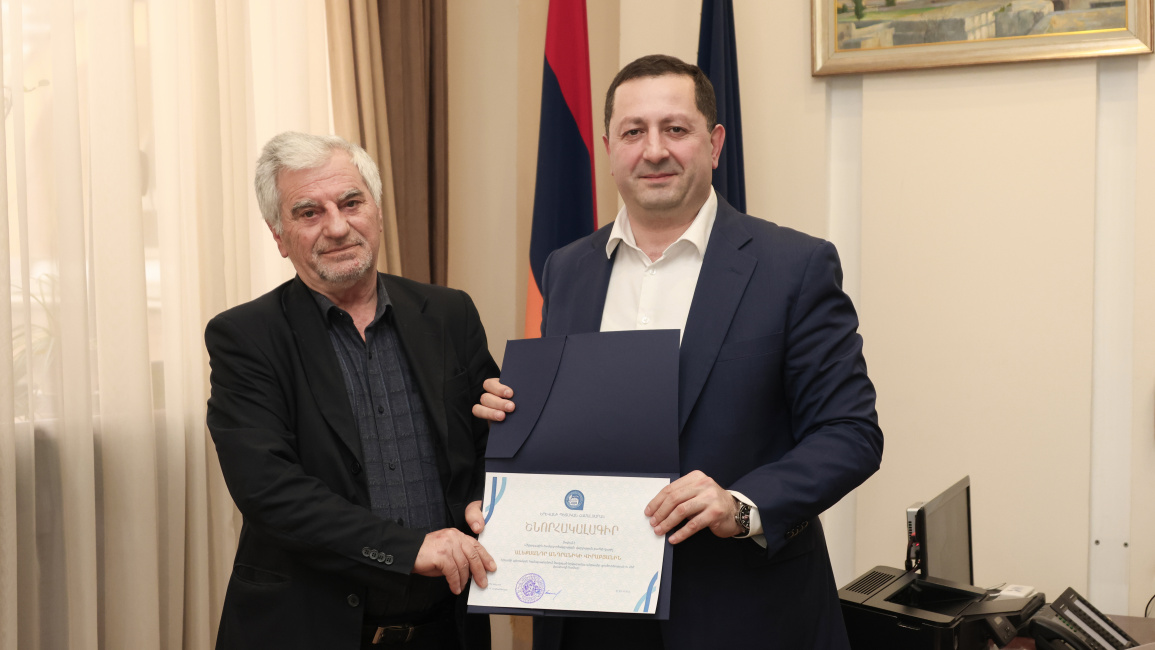 ԵՊՀ ռեկտոր Հովհաննես Հովհաննիսյանը օտարերկրյա սովորողների կրթության կազմակերպման բաժնի վարիչ Ալեքսանդր Վիրաբյանին հանձնեց շնորհակալագիր՝ ի նշանավորումն համալսարանական աշխատանքային բազմամյա և արդյունավետ գործունեության: