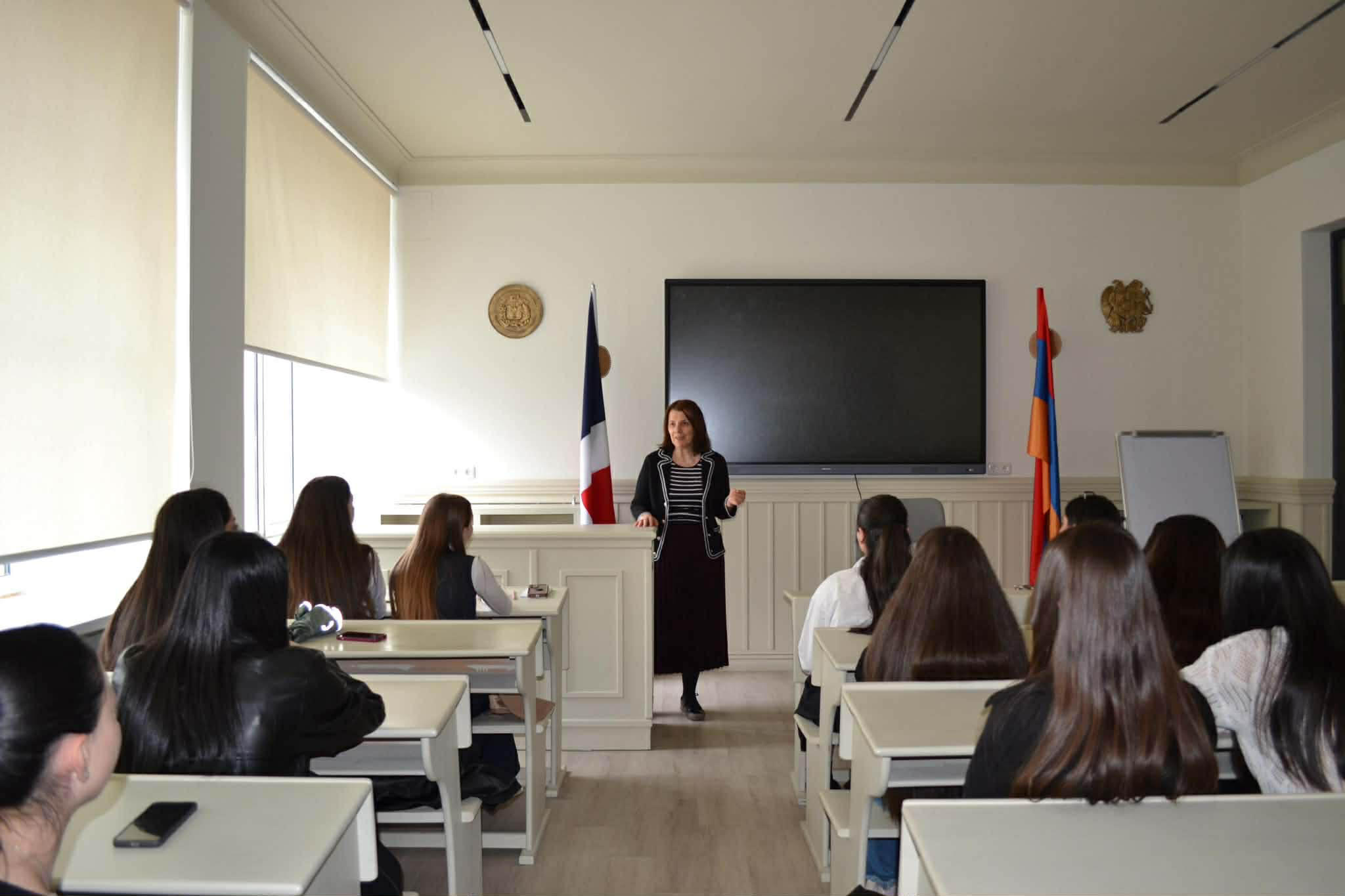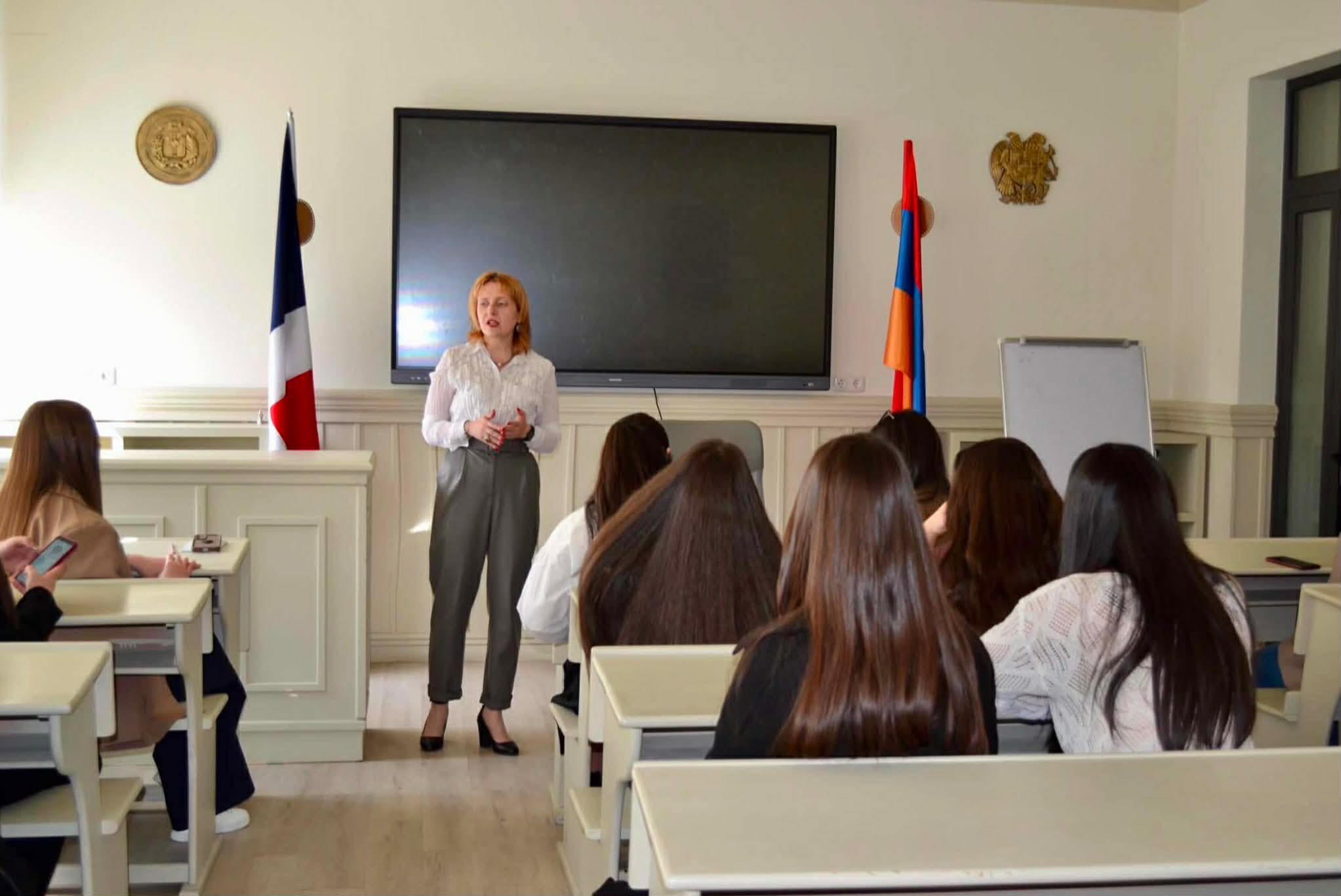 Временно исполняющая обязанности декана факультета европейских языков и коммуникации ЕГУ Марине Ягубян выступила с приветственным словом. Затем заведующая кафедрой романской филологии Асмик Багдасарян, заведующая кафедрой теории и практики перевода Рузан Казарян и заведующая кафедрой немецкой филологии Гаяне Савоян представили соответствующие образовательные программы.