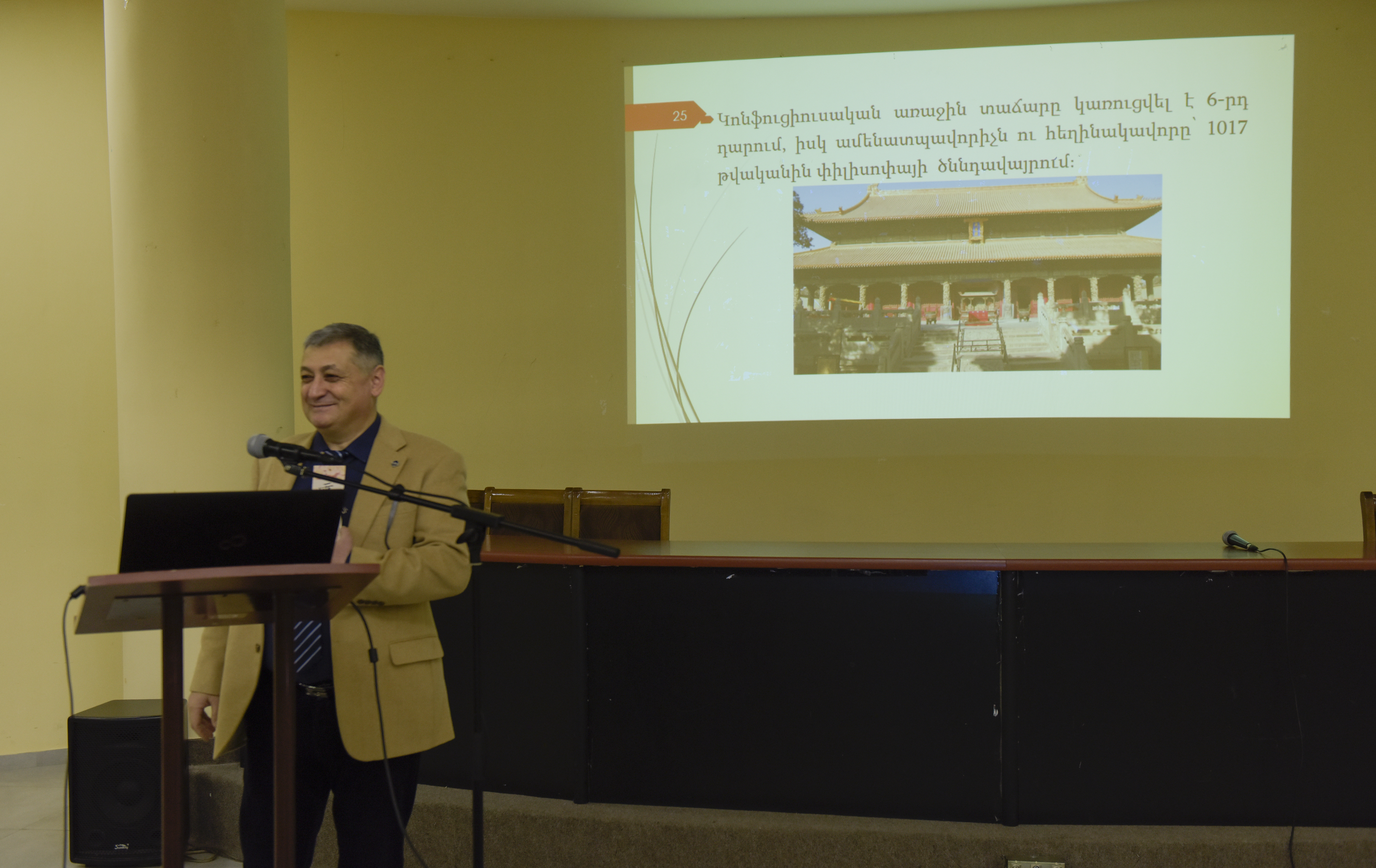 Докладчик дня, доцент кафедры истории, теории философии и логики Ованес Ованисян, представил основные особенности и этапы формирования и развития китайской философской мысли. Были обсуждены основные концепции, закономерности развития и тенденции самых влиятельных направлений: конфуцианства, даосизма, китайского буддизма, легизма, моизма. Были проанализированы проявления китайских философских концепций и традиций, их влияние на разные сферы общественной жизни: образование, семью, политическое руководство, экономическую среду, здравоохранительные практики, общественные отношения.