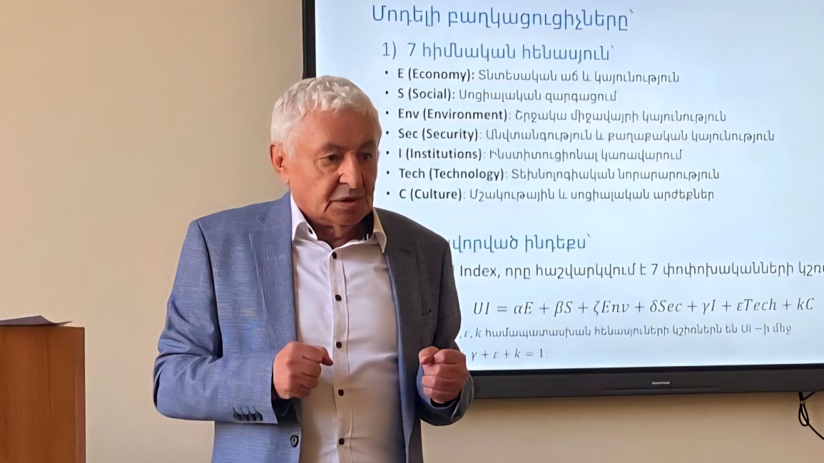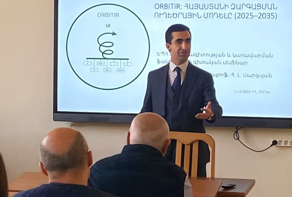 На факультете экономики и управления ЕГУ состоялся очередной научный семинар. Доклад под названием «ORBITIR: орбитальная модель развития Армении (2025-2035гг.)», который был подготовлен в Научно-аналитическом центре конституционной экономики ЕГУ, представил профессор кафедры менеджмента и бизнеса Гайк Саргсян.