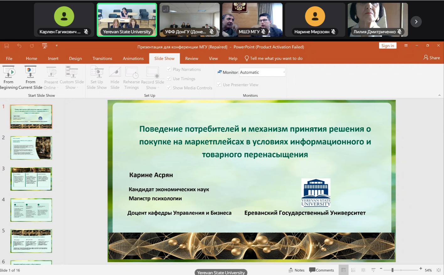 В рамках научной конференции в онлайн-формате доклады представили профессор кафедры экономики и международных экономических отношений Фируза Маилян (тема доклада – «Связь между минимальной заработной платой и бедностью в странах-участницах ЕАЭС»), доцент кафедры управления и бизнеса Карине Асрян (тема доклада – «Поведение потребителей и механизмы принятия решений о покупке на маркетплейсах в условиях информационного и товарного перенасыщения»). Заведующие вышеуказанными кафедрами (доценты Григор Айрапетян и Анна Акопджанян) также присутствовали на научной конференции.
