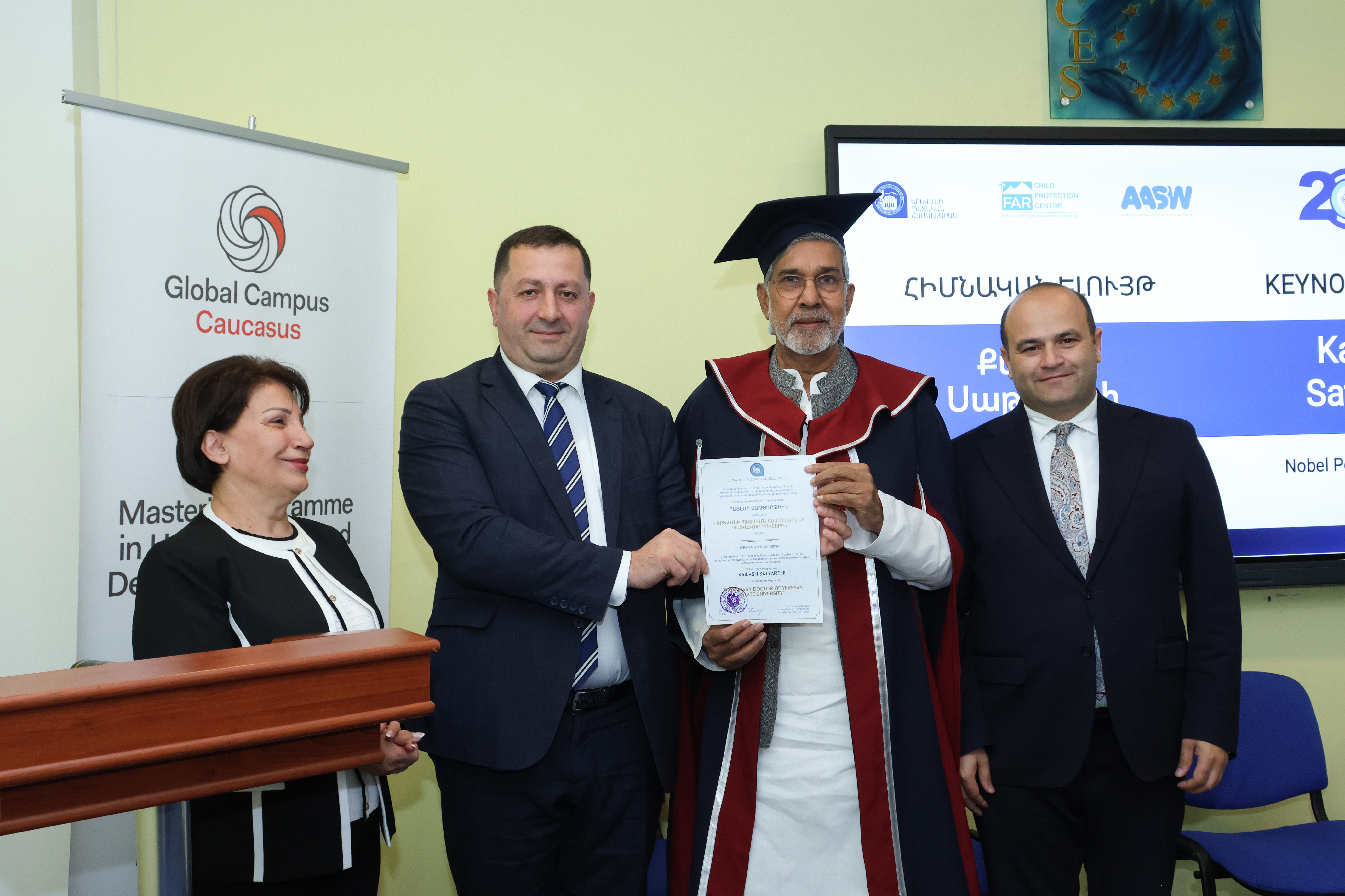 В ЕГУ прошёл семинар на тему «Социальная работа: самоотверженность и сотрудничество», посвященная Международному дню социального работника, в рамках которого ректор ЕГУ Оганнес Оганнисян присвоил лауреату Нобелевской премии мира Кайлашу Сатьяртхи звание «Почётный доктор ЕГУ».