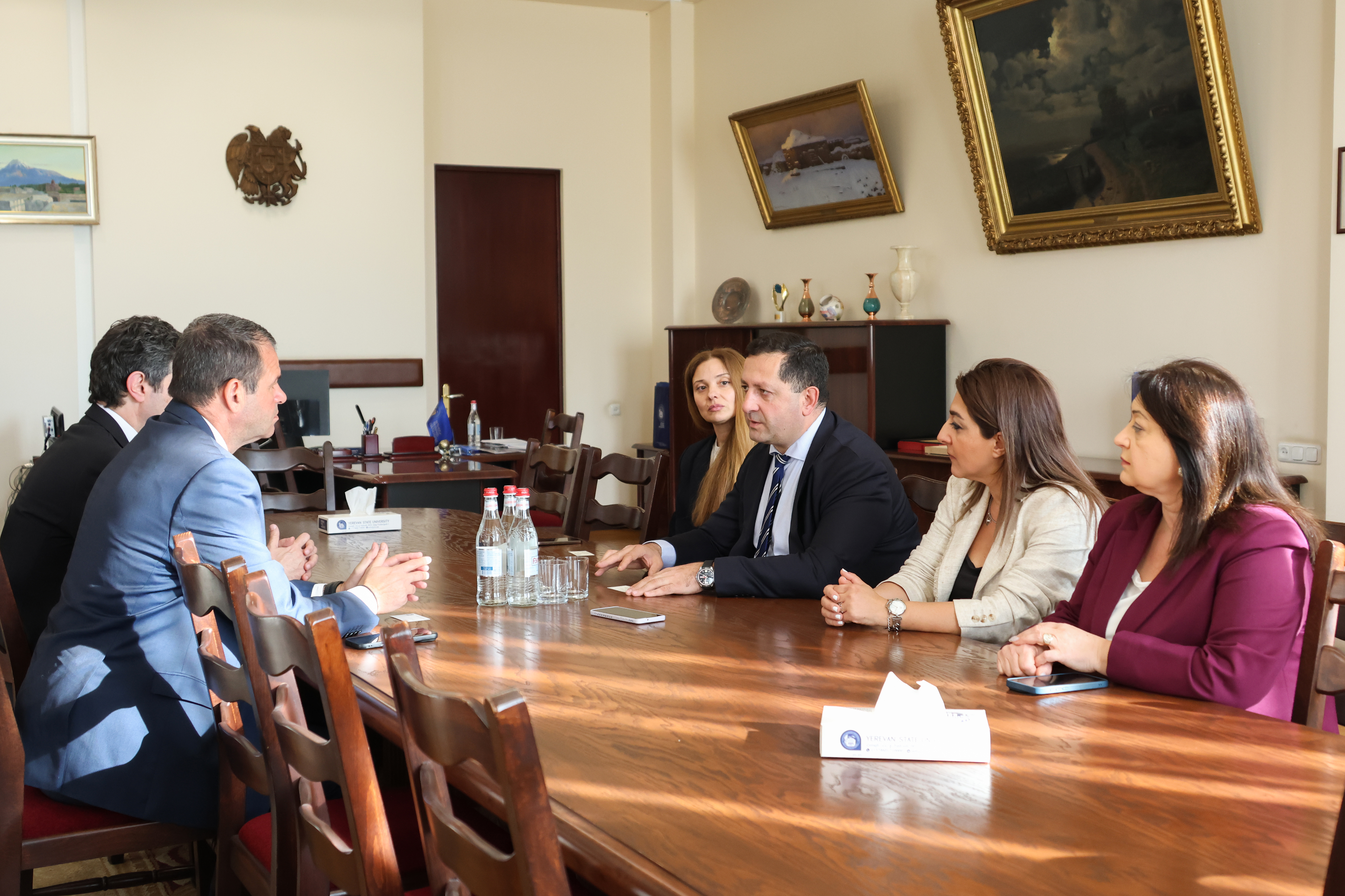 Ректор ЕГУ представил партнерам основные направления деятельности университета, подчеркнув научный потенциал ЕГУ и роль международного сотрудничества. По его словам, ЕГУ сегодня – ключевая площадка в научной жизни Армении, а благодаря новому закону, регулирующему сферу, ожидается, что ЕГУ станет главным исследовательским центром страны.