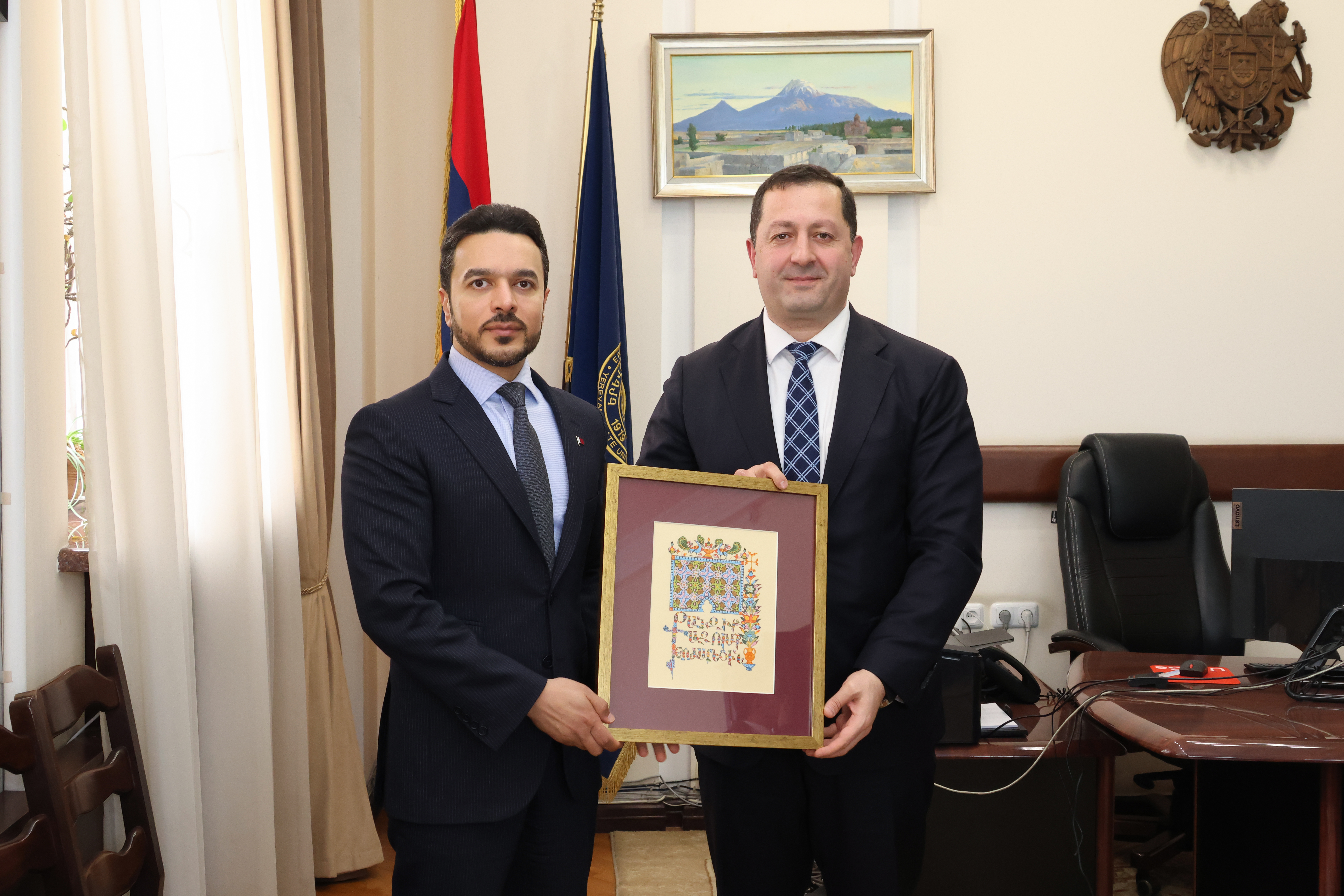 YSU Rector Hovhannes Hovhannisyan hosted Mansour Abdulla Salem Saad Al Sulaitin, Ambassador Extraordinary and Plenipotentiary of the State of Qatar to Armenia. During the meeting, discussions focused on areas of mutual interest in education, science, and culture, as well as on potential steps for strengthening bilateral cooperation.