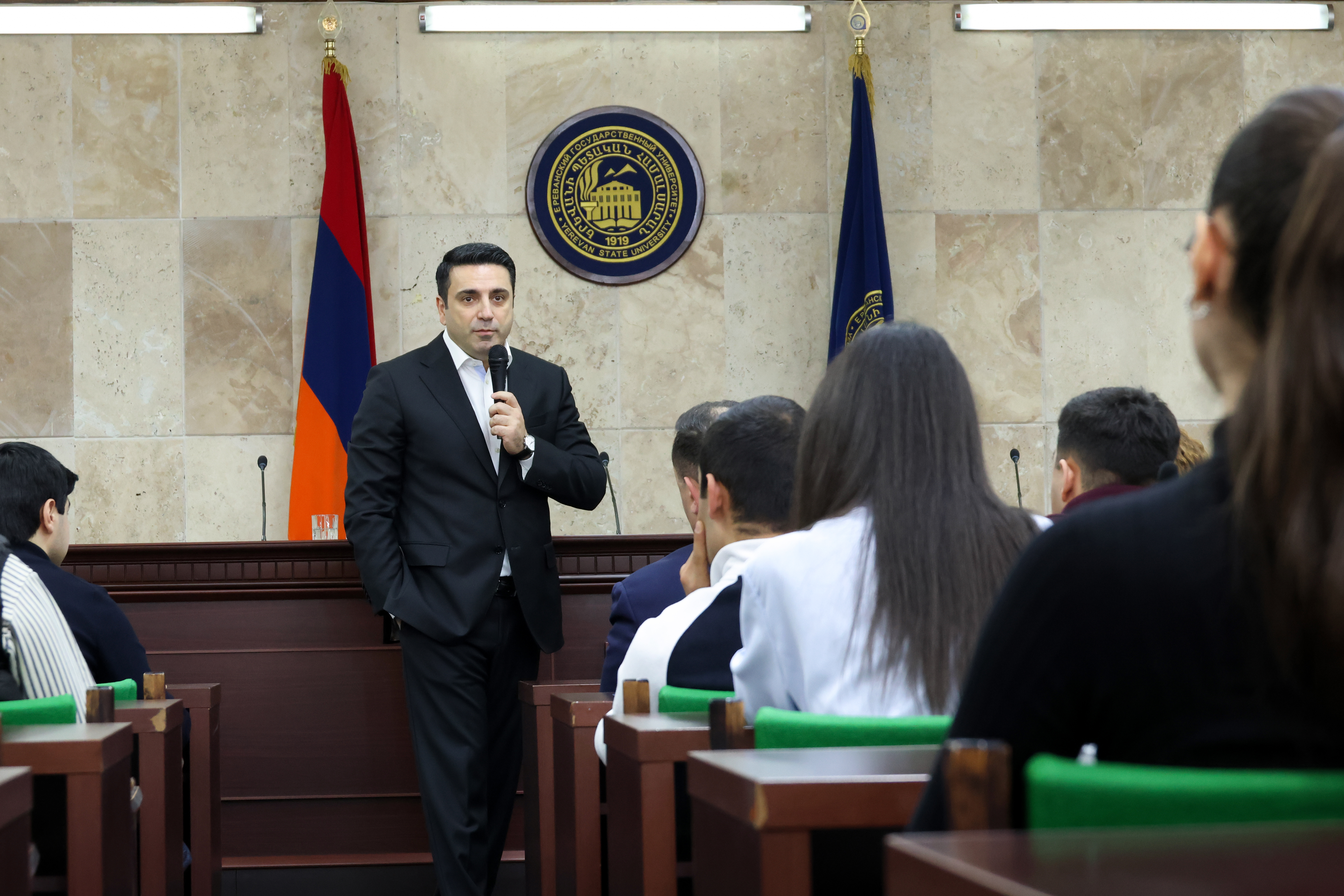 Armenian Speaker of Parliament Alen Simonyan visited Yerevan State University. During his visit, he toured several faculties and research centers, familiarizing himself with recent infrastructure improvements, newly established research centers, laboratories equipped with modern technology, and renovated classrooms across the university.