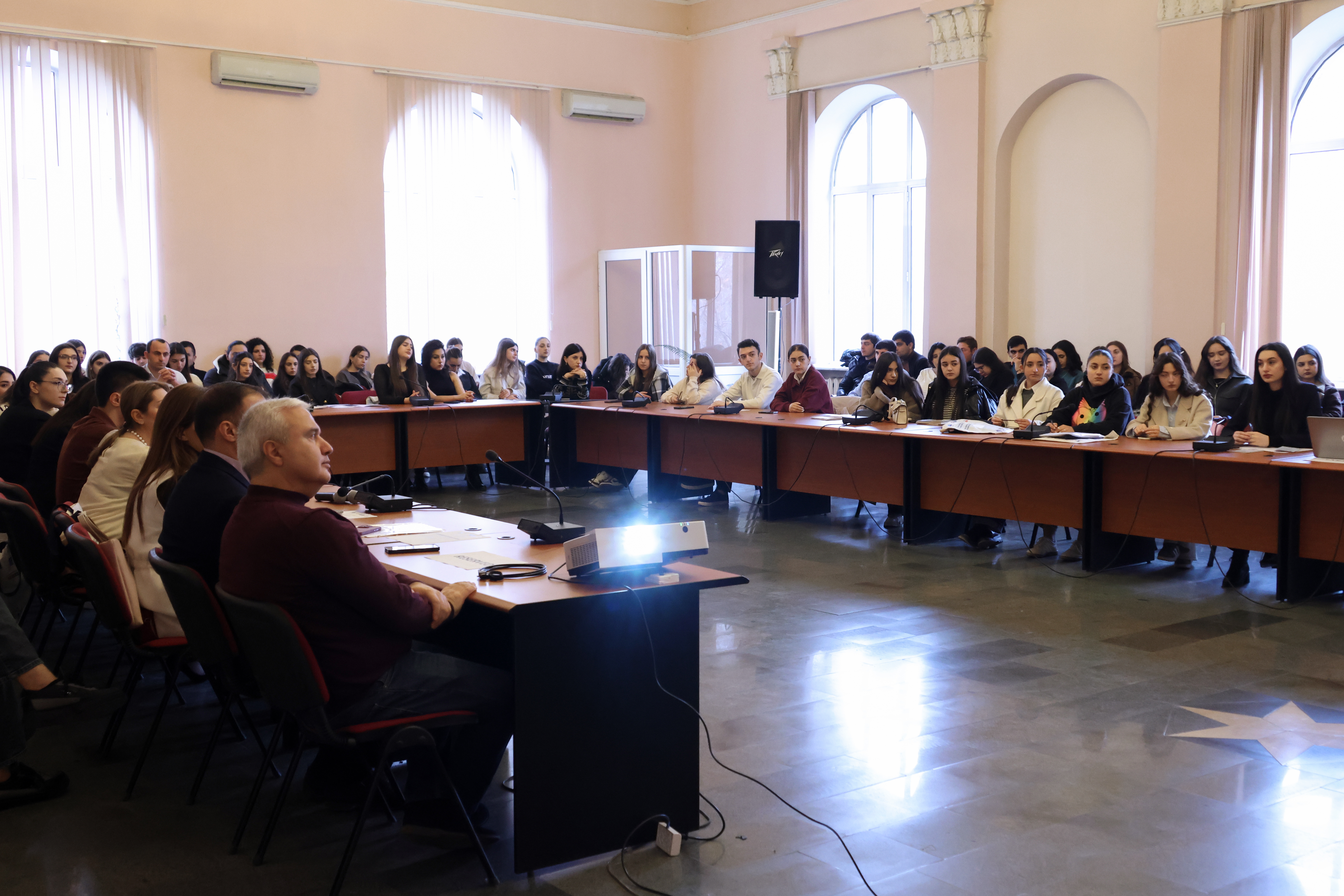 Ректор ЕГУ Оганнес Оганнисян, приветствуя гостей, отметил, что в качестве важного и обязательного компонента образования для студентов регулярно организуются встречи-дискуссии с международными экспертами, профессорами и преподавателями. В этом контексте он также высоко оценил участие коллег, прибывших в Армению в связи с Международным днём прав человека, в организованном в ЕГУ обсуждении.