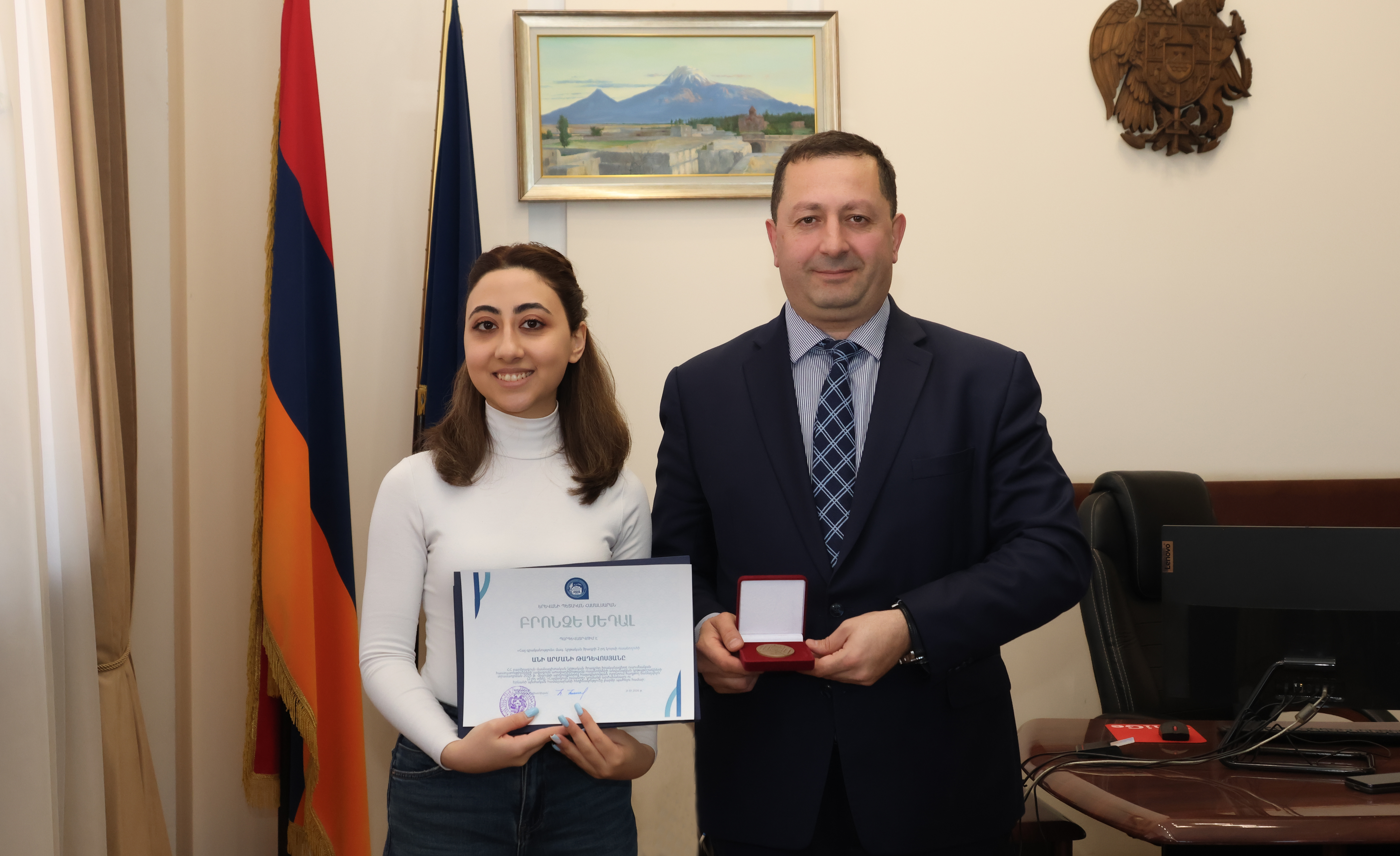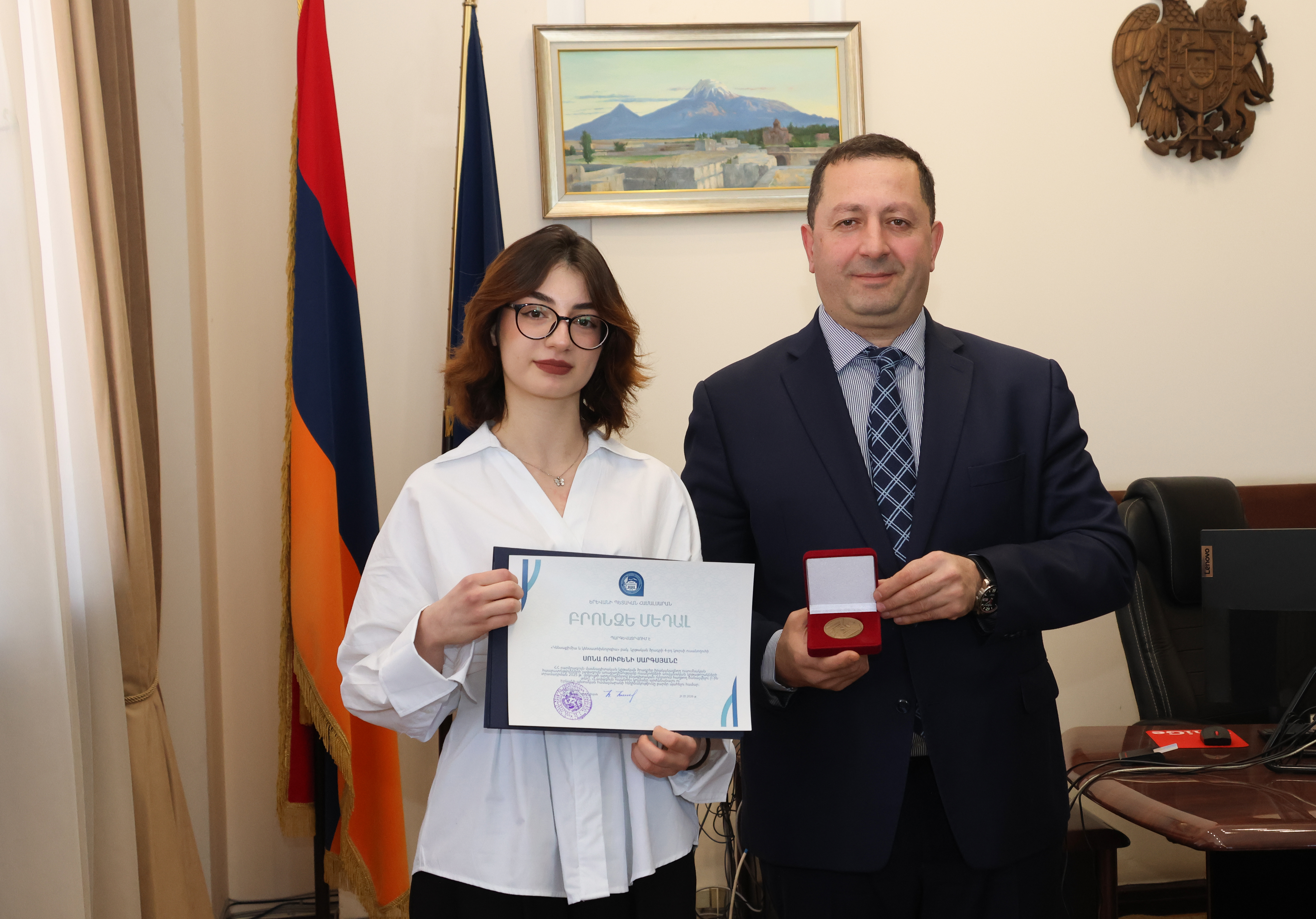 Ректор ЕГУ Оганнес Оганнисян вручил бронзовые медали победителям конкурса 2025 года на предоставление именных стипендий лучшим студентам учебных заведений, реализующих программы высшего профессионального образования в Республике Армения («Лучший студент»): Соне Саргсян, студентке 4-го курса образовательной программы «Биохимия и биотехнология» бакалавриата биологического факультета (первое место) и Ани Тадевосян, студентке 2-го курса образовательной программы «Армянская литература» магистратуры факультета армянской филологии (второе место).